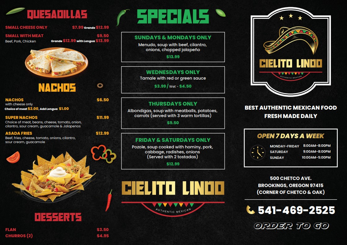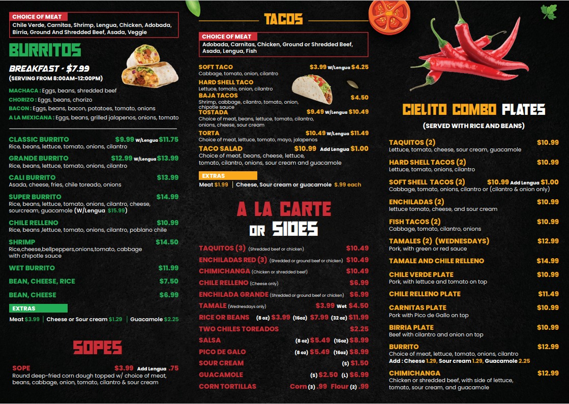 The menu at Cielito Lindo offers a straightforward and inviting selection of Mexican favorites that suit a variety of mealtimes and moods. Whether you're looking for a quick breakfast or a satisfying takeout lunch, the offerings lean toward casual, familiar dishes made with generous portions and authentic flavors.